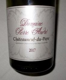 Châteauneuf du Pape blanc 2017 – Domaine Pierre André à Courthézon : nez fin et complexe, ouverture sur de belles notes florales suivie par des nuances d’herbes aromatiques (menthe, romarin) qui se révèlent après oxygénation, bouche ample, matière dense et structurée, équilibre sec, finale nette avec de beaux amers salivants.