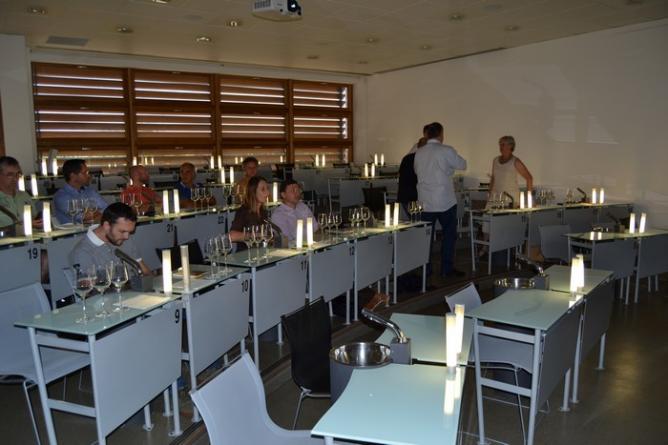 La salle de dégustation de la maison Wolfberger à Colmar avec les premiers participants qui s’installent.